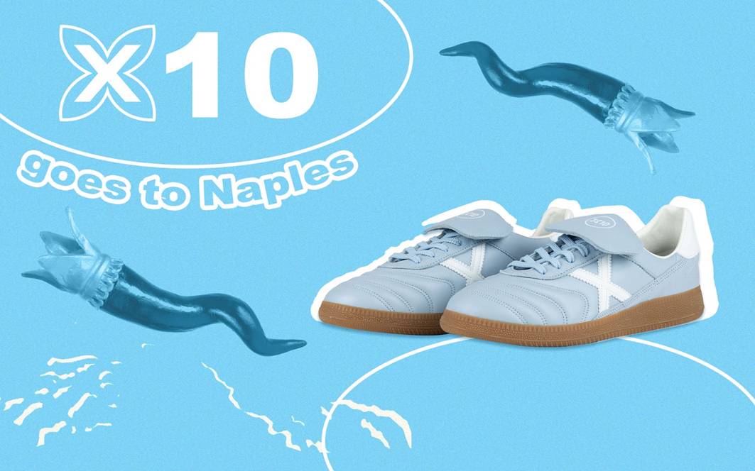 La nuova sneaker X10 nasce dall’incontro tra l’eredità calcistica di MUNICH e la passione incondizionata di Napoli per il gioco più amato al mondo. Ispirata alla silhouette storica Mundial, la scarpa si sviluppa attorno al duplice significato della “X” – logo del marchio catalano e numero romano dieci. A Napoli, il 10 è molto più di un numero: è il simbolo di un’epoca irripetibile fatta di genialità, magia e trionfi, capace di risuonare nell’immaginario collettivo come emblema di eccellenza e identità.
