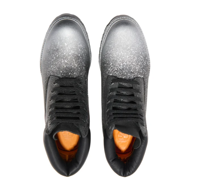Lo stivale originale di Timberland, nato nel 1973 per affrontare condizioni difficili, ha attraversato decenni di evoluzione, diventando poi icona della cultura hip-hop e streetwear. Sfera, con il suo background e la sua fanbase, interpreta quella heritage in chiave contemporanea: partendo da una base total black in pelle nabuk impermeabilizzata, il modello incorpora un effetto crepato verniciato a mano, un tocco aerografato argentato e la label “S€” decorata con cristalli, come un autentico gioiello da indossare.