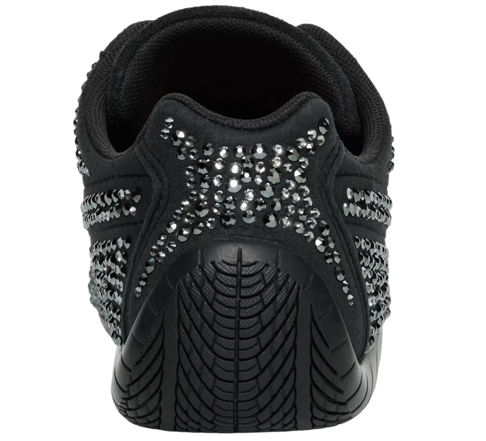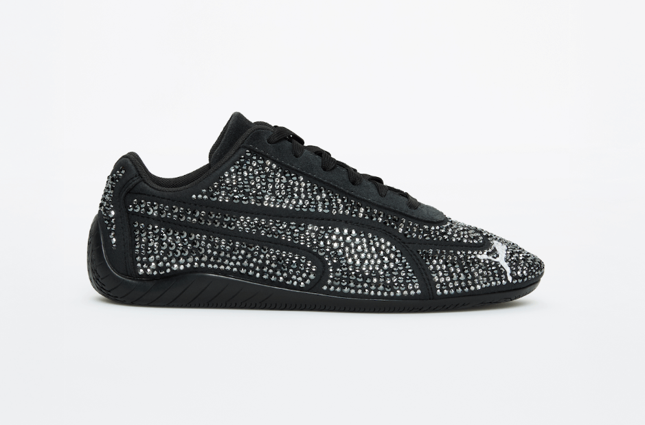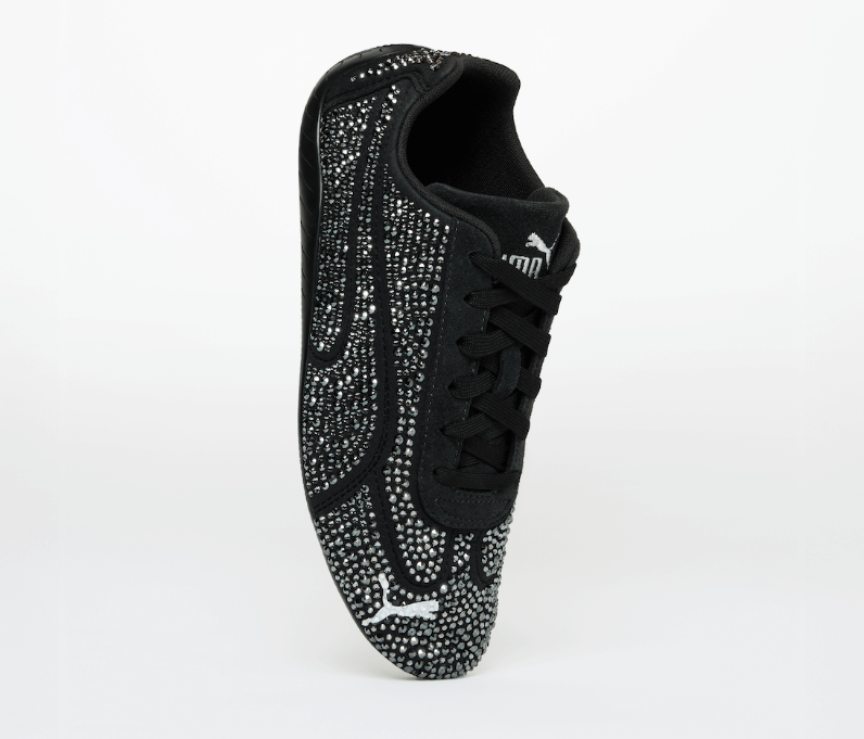 La tomaia viene completamente ricoperta da oltre 5.300 cristalli neri, applicati a mano in diverse dimensioni per seguire le curve aerodinamiche del modello. Il risultato è un look scintillante ma non eccessivo, anche grazie alla palette total black che bilancia eleganza e versatilità. Restano invariati il profilo basso e la suola sottile, tratti distintivi della Speedcat originale.
