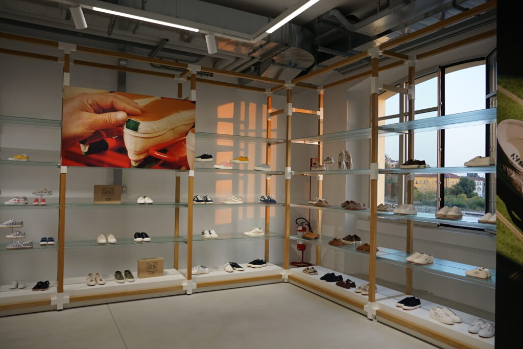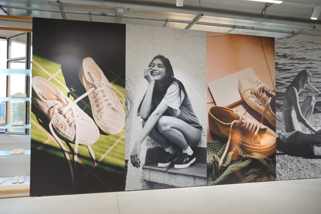 I maxi pannelli fotografici allestiti nello showroom raccontano l’universo Superga: libertà, giovinezza, giornate di sole e momenti autentici. L’heritage è presente, ma reinterpretato con leggerezza. Ogni scatto trasmette una sensazione di quotidianità raffinata, quella stessa che ha reso le Superga un capo essenziale del guardaroba italiano.