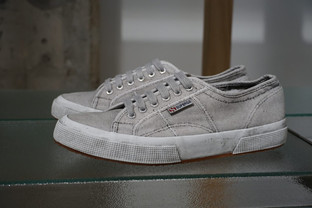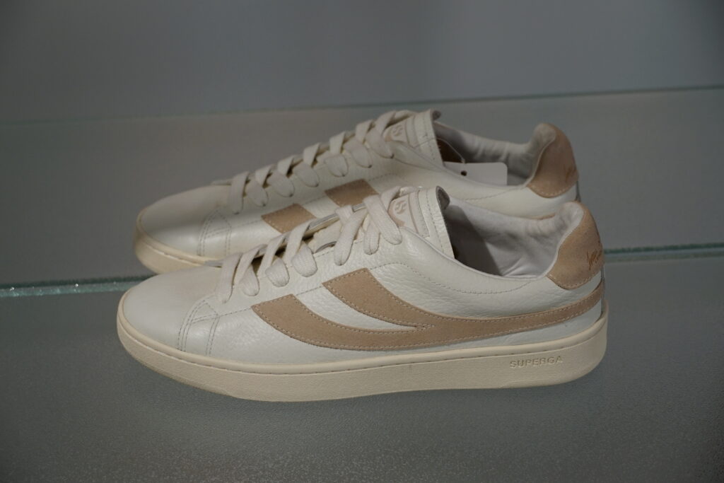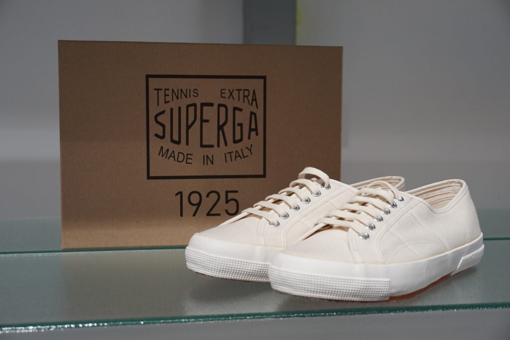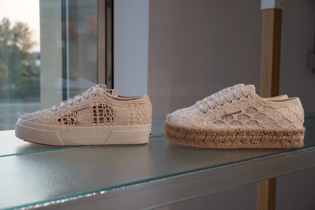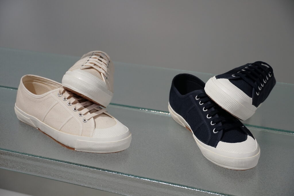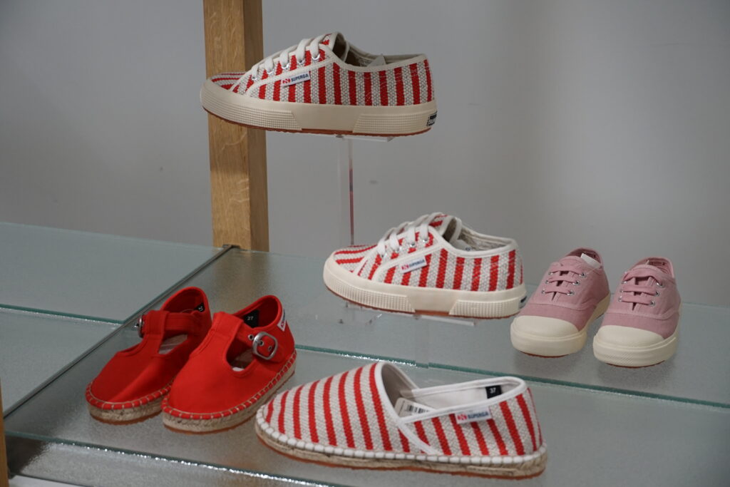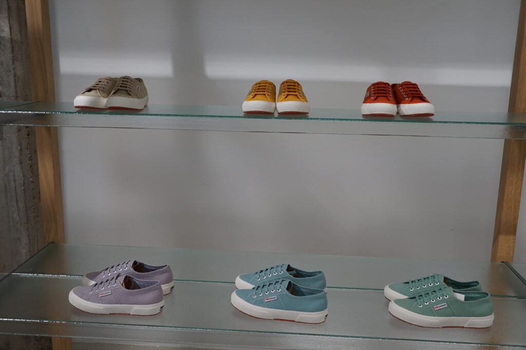 Le immagini scattate durante l’anteprima esclusiva della collezione (vedi gallery) raccontano un allestimento minimal e luminoso, dove le Superga sono protagoniste assolute. Esposte su scaffali in vetro e legno, in una cornice moderna ma calda, le nuove versioni della 2750 colpiscono per la varietà cromatica e materica: dal classico bianco, ai modelli in tela cerata, fino alle righe marinare e ai motivi crochet.