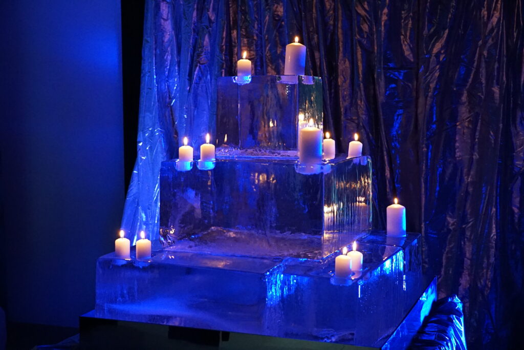 L’atmosfera del party era surreale e scenografica: luci blu ghiaccio, fondali effetto neve e giochi di riflessi creavano una cornice che richiamava la collezione FW25 dal titolo “Snow Much Fun”. Al centro dello spazio, blocchi di ghiaccio trasparente con candele accese donavano un’aura poetica e inaspettatamente calda, in perfetto equilibrio tra artigianalità e tecnologia.