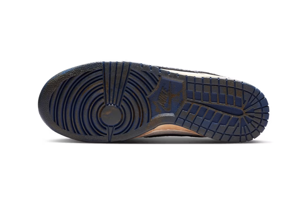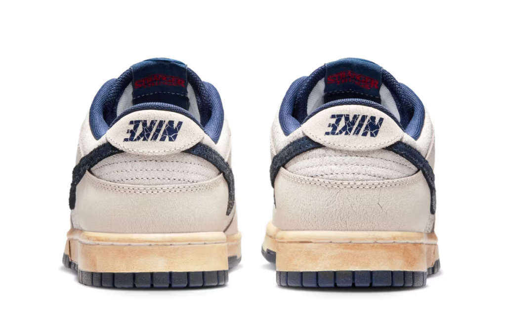 La versione “Phantom/Midnight Navy” spicca per la tomaia in pelle chiara con effetto “crepa” (cracked leather), che richiama l’immaginario rovinato e disturbante dell’Upside Down. I Swoosh rovesciati sulla linguetta, sull’intersuola e sul tallone ribadiscono il richiamo alla dimensione parallela della serie, mentre il battistrada “pre-ingiallito” dà un look vissuto, come se la scarpa avesse attraversato portali e spazi alternativi.
