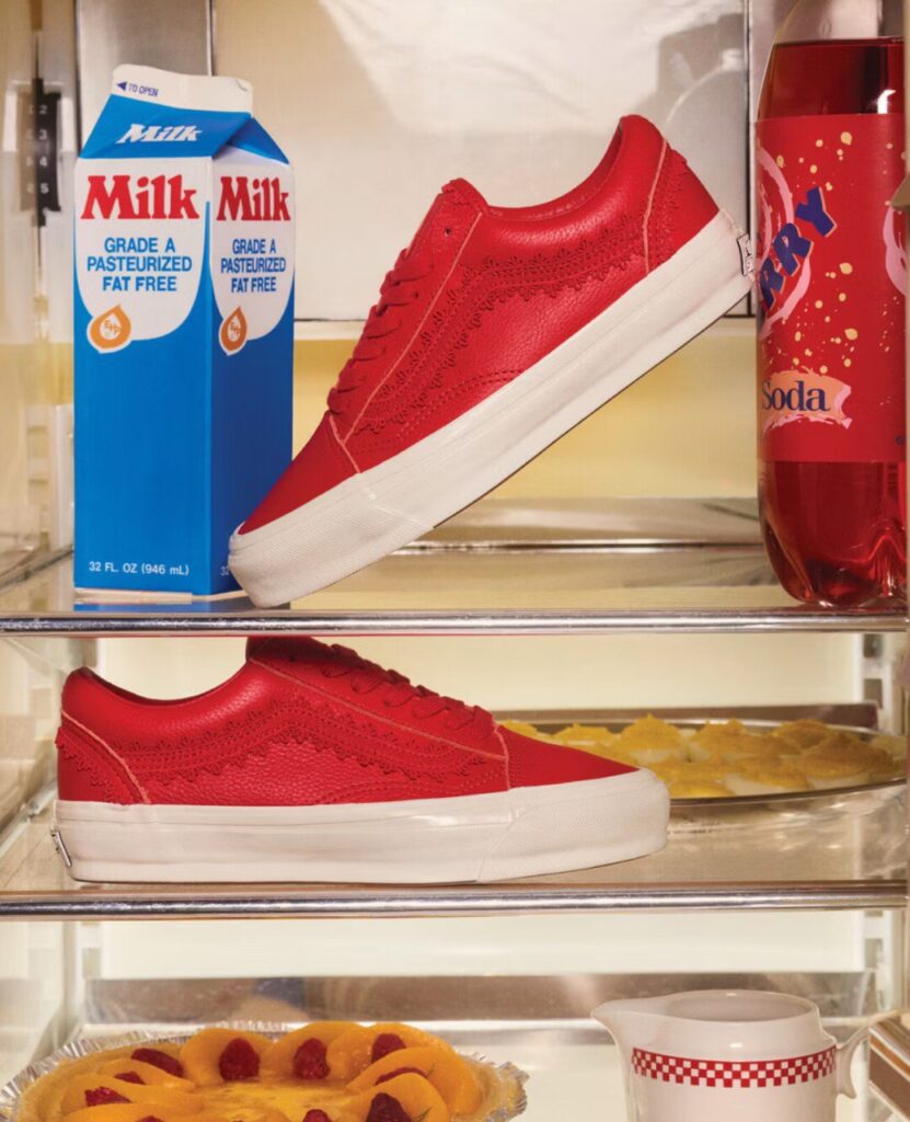 Ma non si ferma lì: tra le proposte troviamo anche varianti più audaci come Knu Skool, Super Lowpro e Mary Jane Creeper, tutte arricchite da elementi come perle, pizzi, dettagli metallici e tonalità festive come il rosso e il bordeaux. L’insieme suggerisce un’eleganza alternativa, pronta a integrarsi sia con outfit casual sia con look più curati.