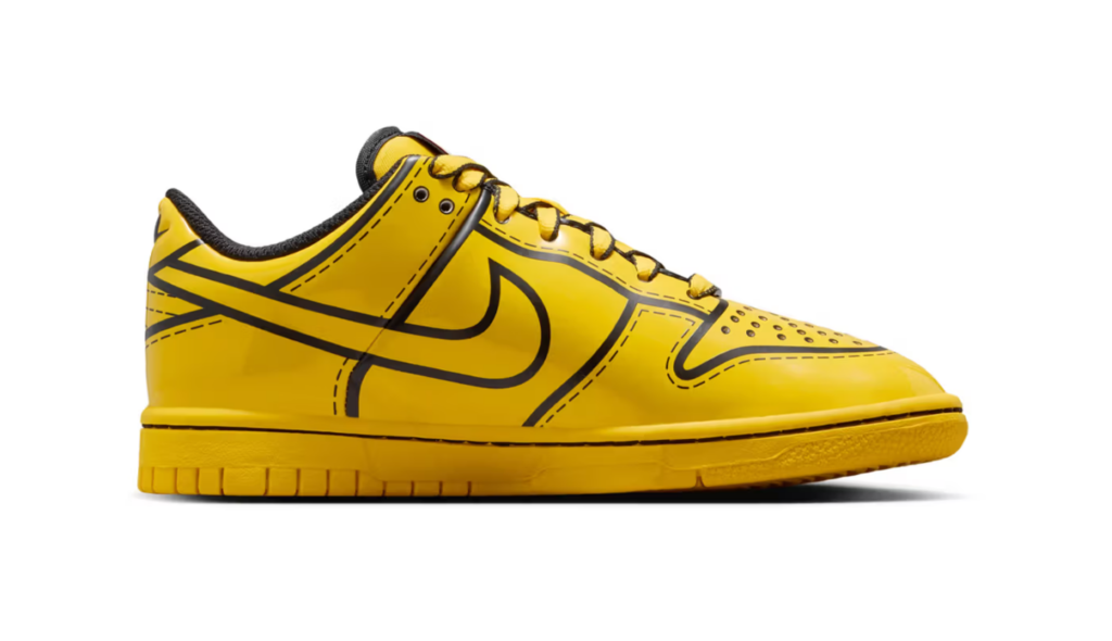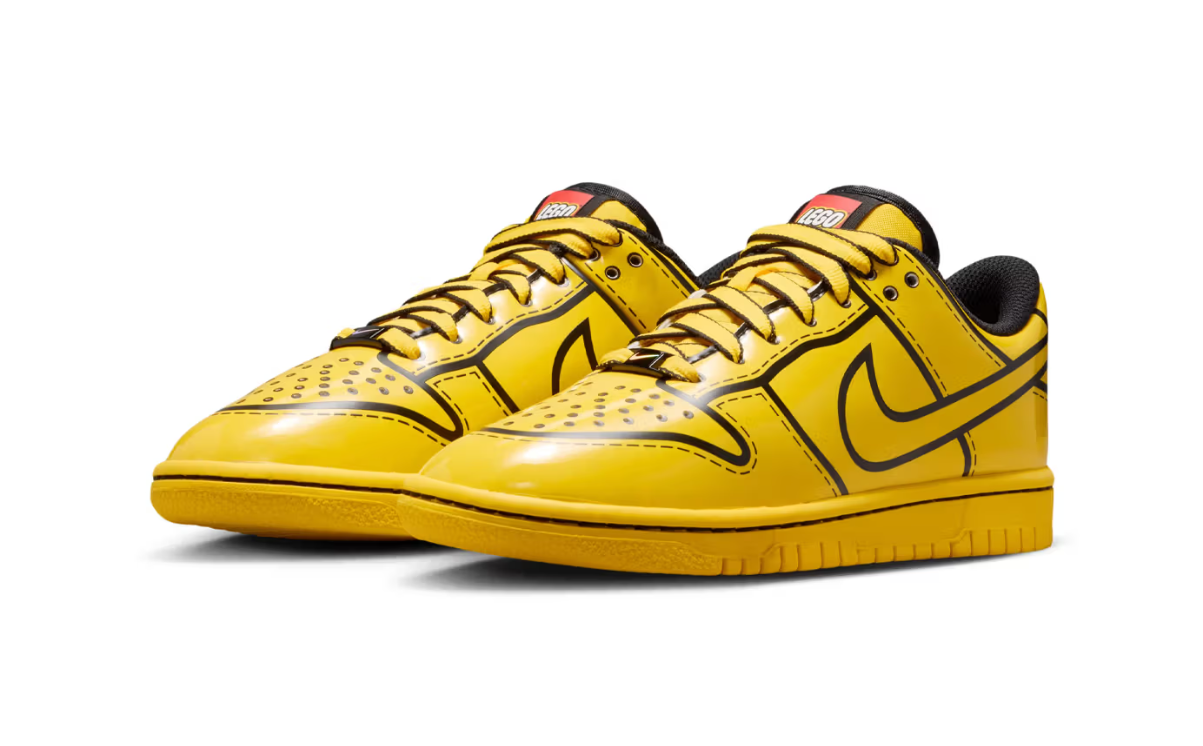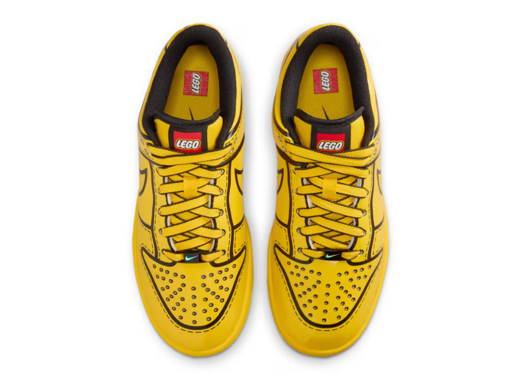 Nike e LEGO tornano a collaborare dando vita a una nuova versione della Dunk Low, questa volta nella vibrante colorazione “Tour Yellow”. Il modello si ispira direttamente ai celebri mattoncini danesi, con una tomaia gialla brillante, dettagli neri a contrasto e inserti lucidi che richiamano la texture plastica dei LEGO.