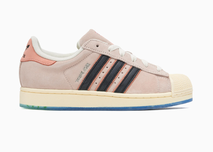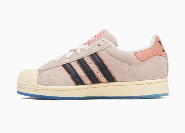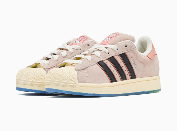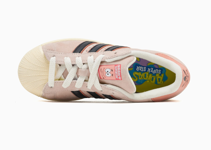 La tomaia in suede rosa riprende il colore della pelle di Patrick, mantenendo però l’impronta premium delle versioni più curate della Superstar. La punta in gomma rimane in stile “shell toe”, ma con una tonalità beige che si integra bene con l’upper. Le Three Stripes nere aggiungono contrasto, mentre sulla linguetta compare il volto sorridente di Patrick, dettaglio semplice ma immediatamente riconoscibile.