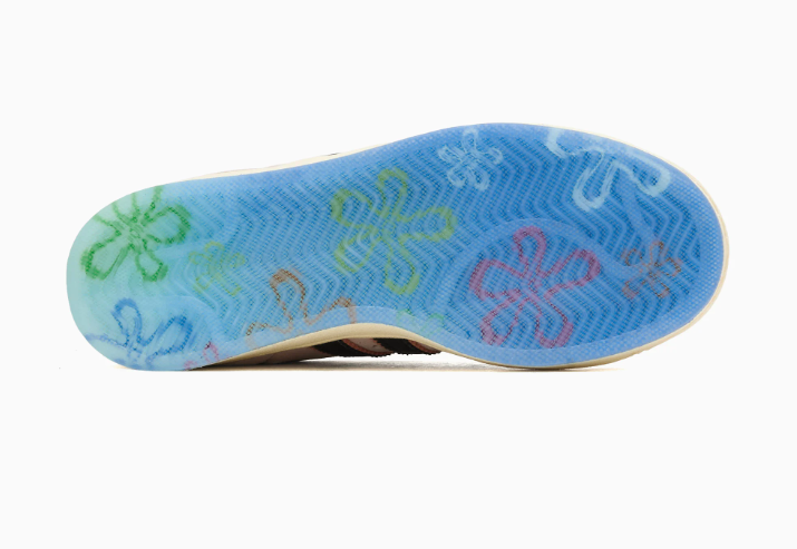La suola semi-trasparente azzurra è il colpo di scena: lascia intravedere una grafica ispirata al fondale marino di Bikini Bottom, rendendo la sneaker divertente ma non esagerata. Le stringhe opzionali riprendono i colori dei pantaloncini floreali di Patrick, un tocco di personalità che strizza l’occhio ai fan più attenti.