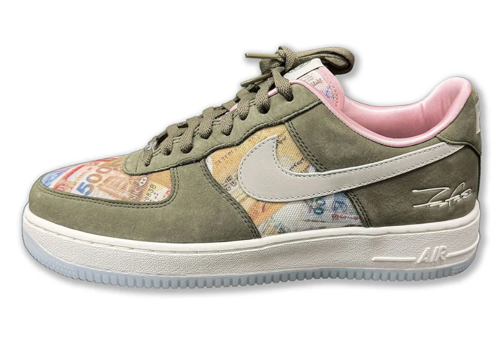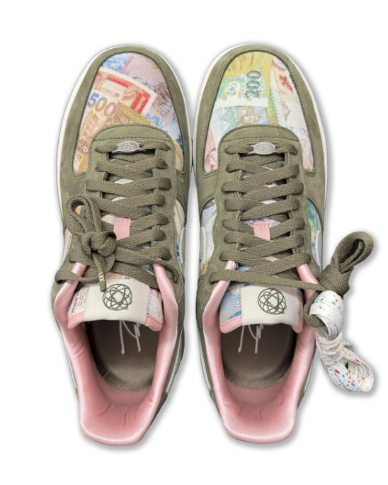 La sneaker presenta una combinazione di materiali e dettagli fortemente simbolici. La base è caratterizzata da grafiche ispirate al concetto di valore e scambio, mentre gli overlay in tonalità verde oliva e il lining interno in raso rosa richiamano il linguaggio visivo tipico di Futura. Sul tallone compare la sigla LXX, riferimento diretto ai 70 anni dell’artista, mentre dettagli come la numerazione individuale e i lacci con effetto pittorico rafforzano il legame con il mondo dell’arte.