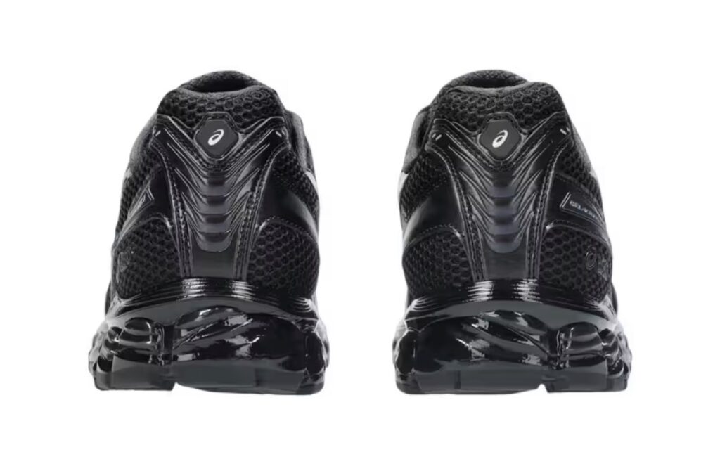 La sneaker si apre con una base nera profonda, bilanciata da tonalità grigio-fumo e dettagli bianchi che spezzano la monocromia con eleganza. Il risultato è una palette sobria ma visivamente interessante, che mantiene un profilo urbano pur restando fedele alle radici tecniche della Kayano.