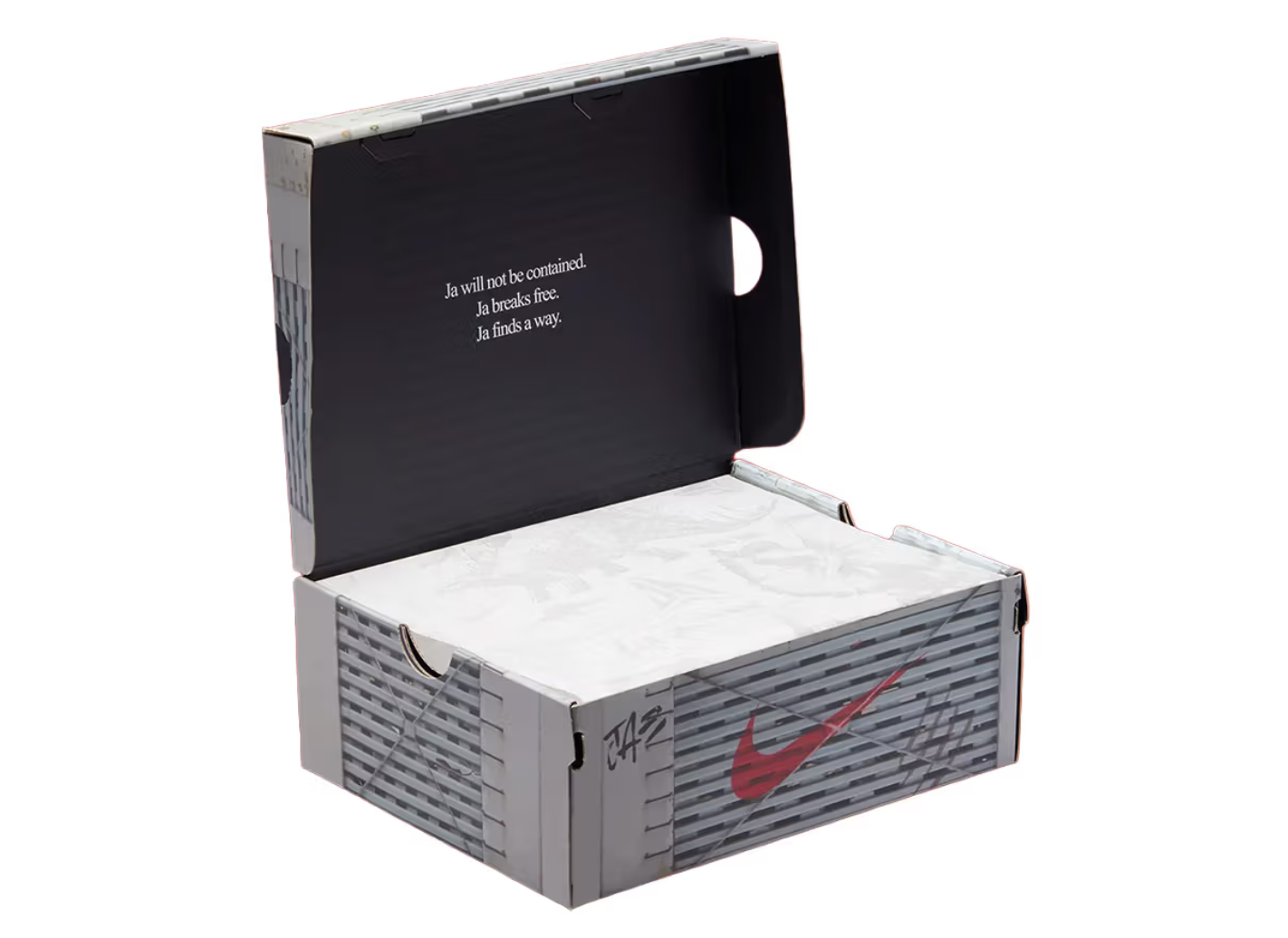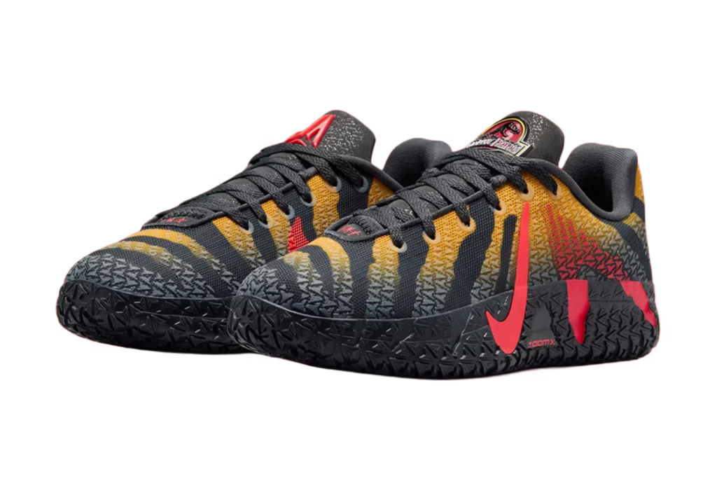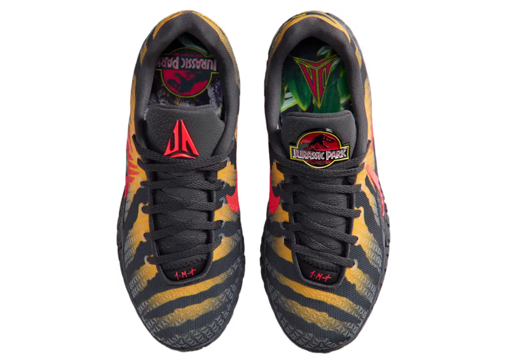 Quello che distingue una buona collaborazione da una grande collaborazione è la profondità dei dettagli, e qui Nike non si è risparmiata. Sul lato sinistro della linguetta campeggia il classico logo Jurassic Park con il T. rex, affiancato dal marchio “JA” di Morant — un incrocio letterale tra cultura cestistica e iconografia cinematografica.