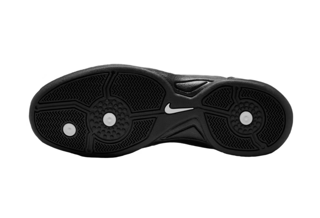 Gli accenti bianchi sui Swoosh laterali interrompono la base scura con un contrasto netto e pulito, l’unica concessione al classico schema cromatico della scarpa da gioco.
