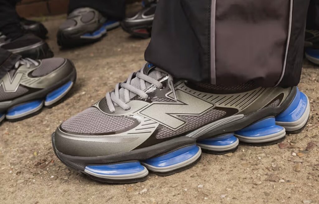 Il secondo è “Grey/Blue”: tomaia bitonale in grigio con mesh e pannelli sintetici stratificati, poggiata su una suola ABZORB in blu a contrasto netto. Un’interpretazione più fredda e pulita, che bilancia perfettamente il peso visivo della suola con la sobrietà dell’upper.