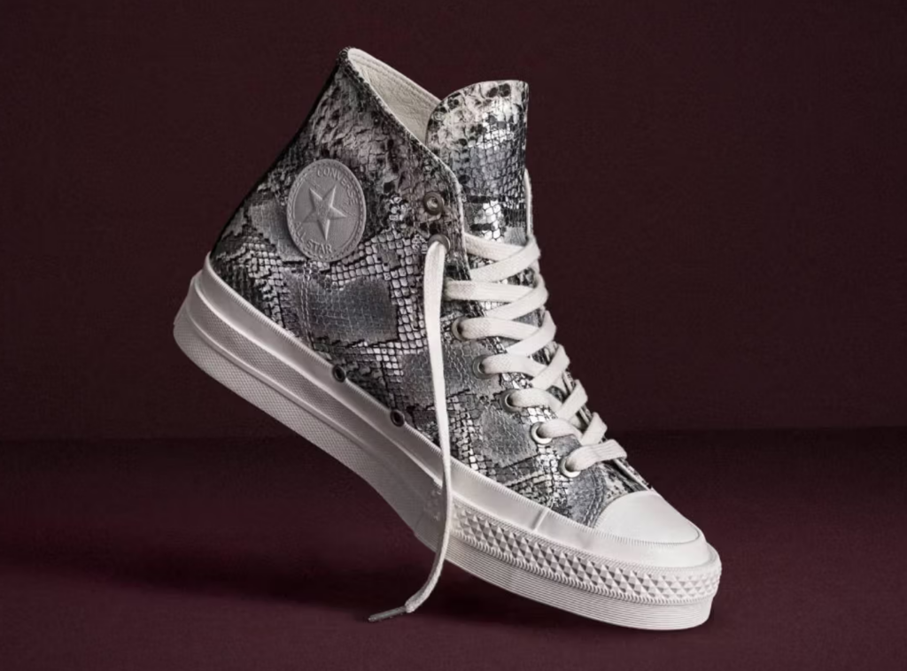 La versione in Snake Print Leather è quella che porta più lontano dal lessico abituale della Chuck Taylor. Il trattamento in pelle stampa serpente in bianco e grigio introduce una texture che appartiene al guardaroba del lusso, non a quello dello skate park e accenti argento distribuiti sulla scarpa aggiungono un riflesso metallico che gioca con la luce. È la versione più dichiaratamente fashion delle tre.