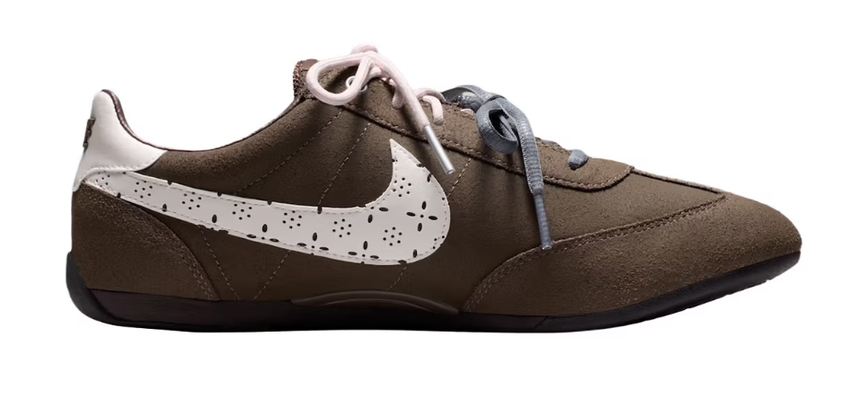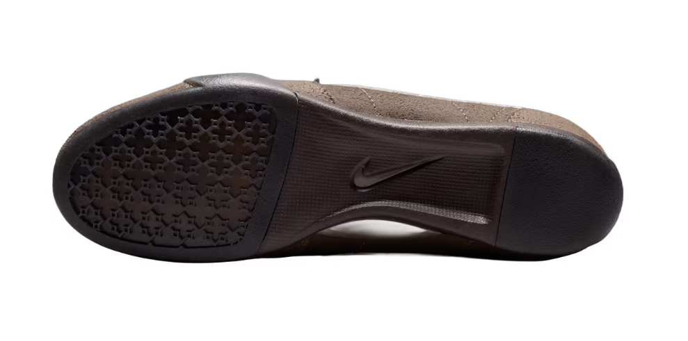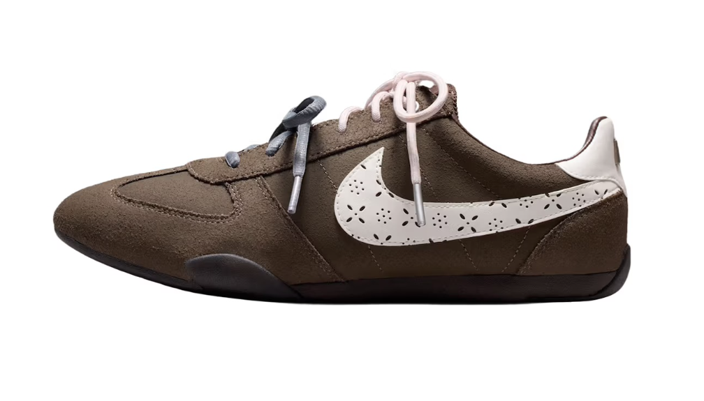 Il primo colorway ufficiale si chiama “Ridgerock” un marrone scamosciato caldo che stabilisce immediatamente il carattere della scarpa: naturale, morbido, lontano dall’estetica atletica tradizionale. La tomaia in suede e canvas combina due texture che lavorano bene insieme, creando profondità visiva senza ricorrere a grafica o color blocking. Lo Swoosh è traforato con un motivo floreale un dettaglio raro nell’universo Nike, che aggiunge carattere senza appesantire la lettura generale della scarpa.