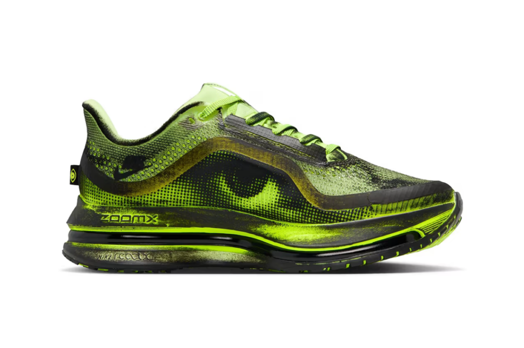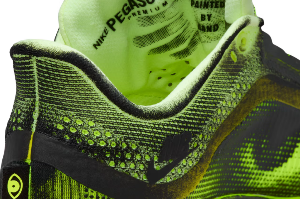 Il Pegasus Premium porta la stessa logica su un colorway radicalmente diverso. La base è Volt il giallo neon elettrico che Nike utilizza da decenni come colore-segnale per la visibilità in condizioni di scarsa luce qui declinato in una variante Cyber/Off White/Noir. Le macchie nere dipinte a mano coprono anche questa superficie, creando un contrasto ancora più netto rispetto all’arancione del Vomero.