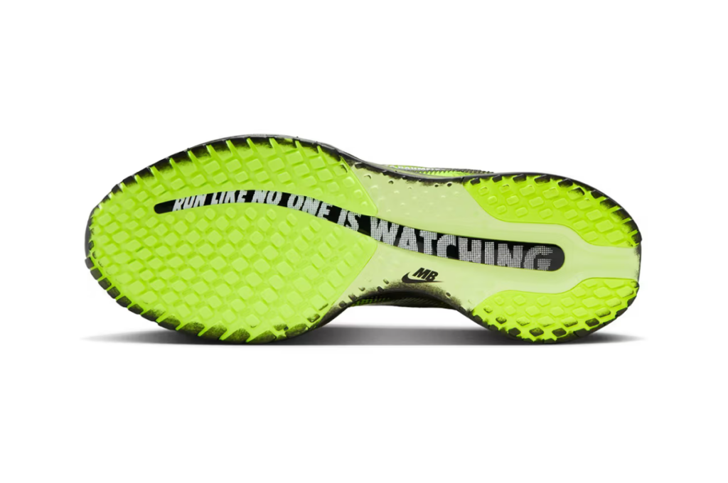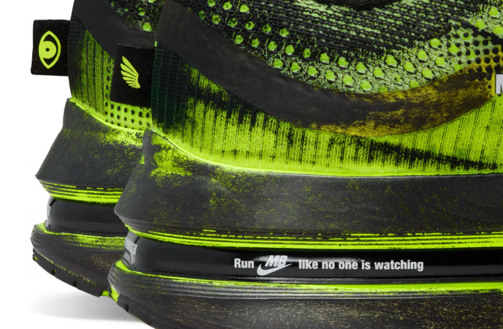 Sul lato mediale, un occhio composto da centinaia di piccoli punti guarda verso l’esterno un’illustrazione che richiede distanza per essere letta nella sua interezza e vicinanza per apprezzarne la densità. Sul fondo della suola Zoom Air, la scritta “Run Like No One Is Watching” è stampata direttamente sul pod di ammortizzazione un messaggio che il runner porta letteralmente sotto i piedi ad ogni passo.